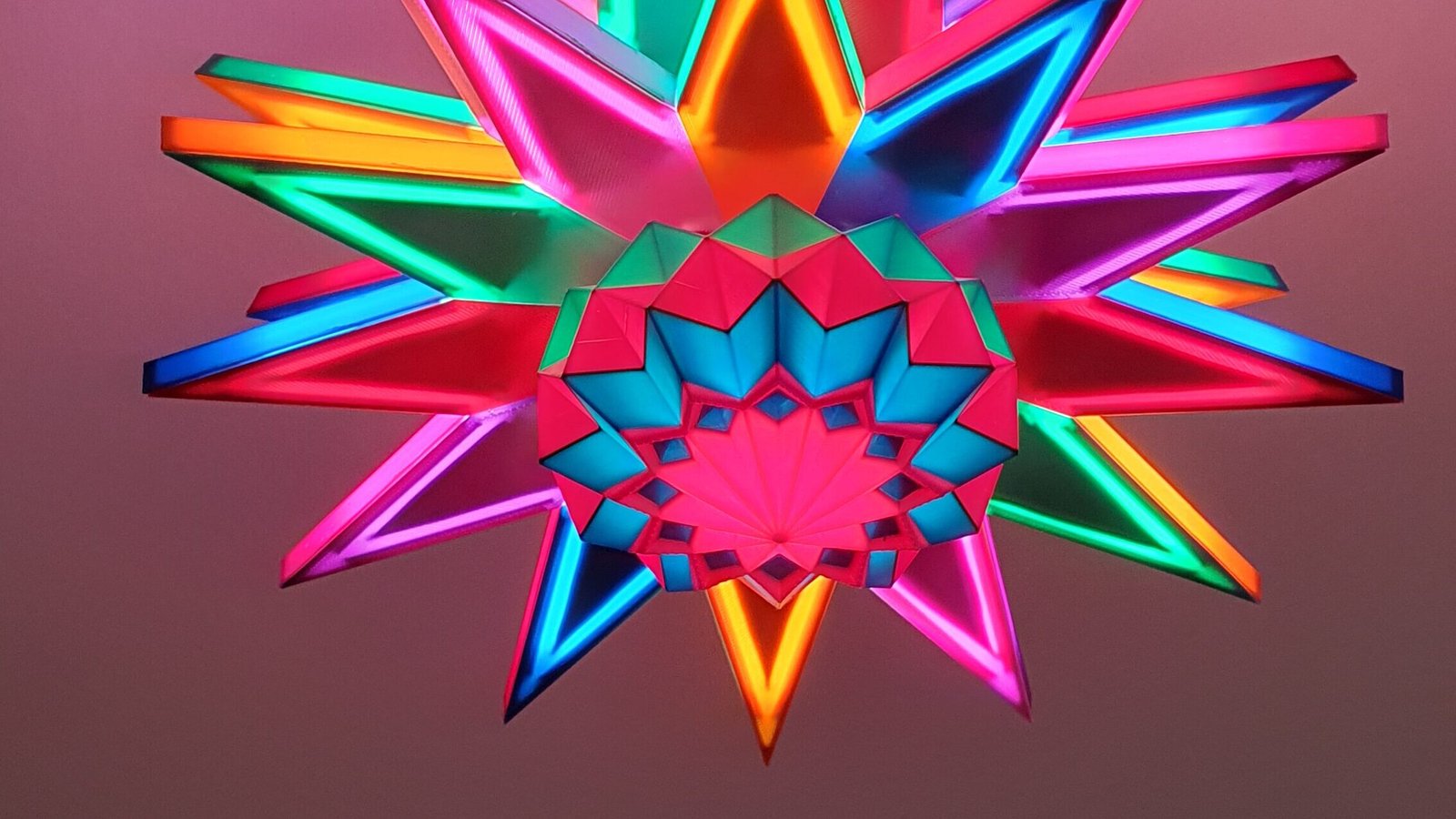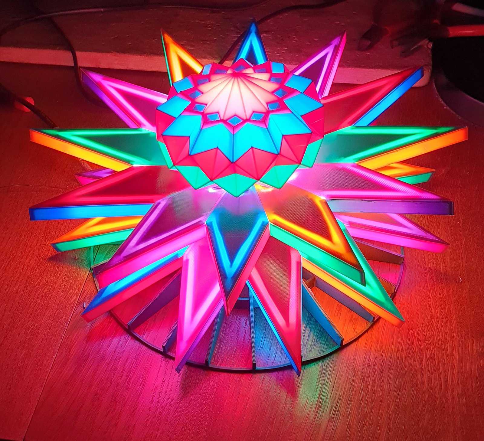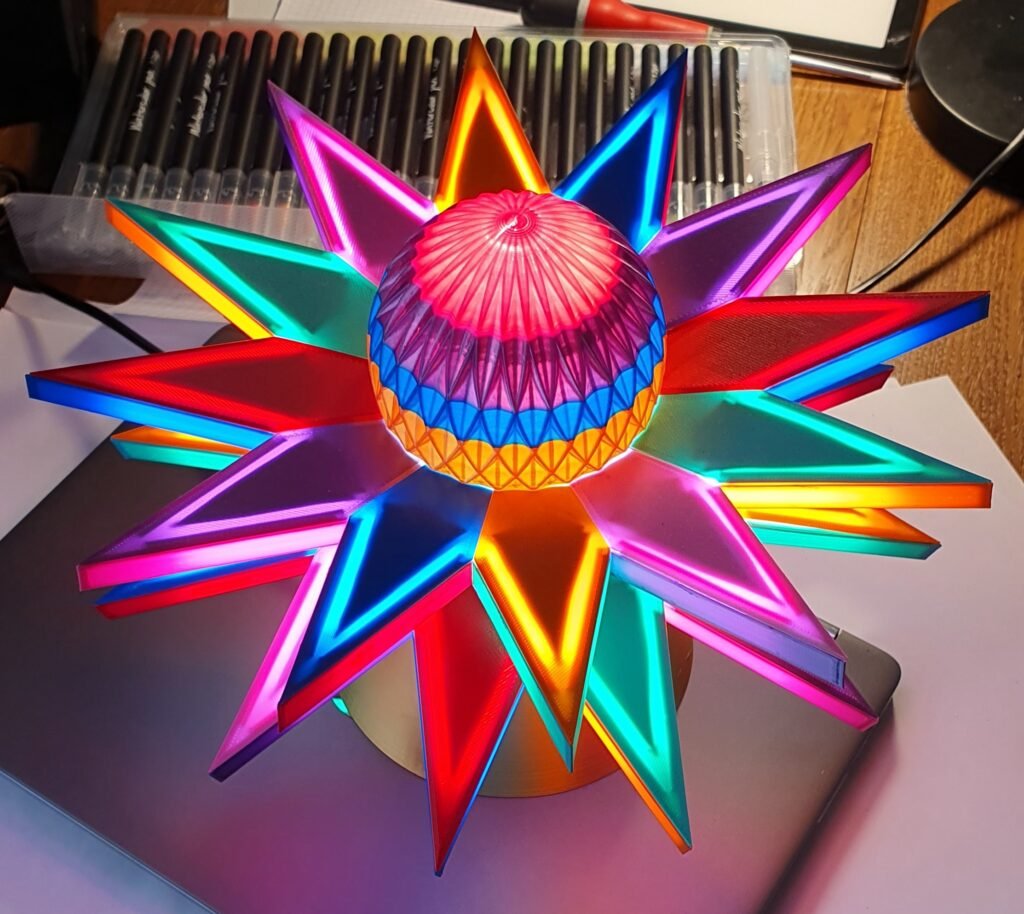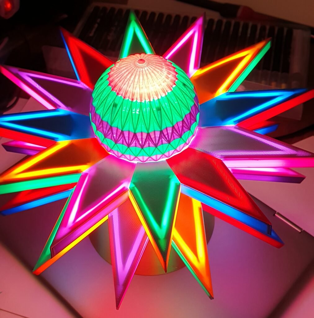 Composé de deux étoiles à douze branches bicolores (jaune, rouge, vert, bleu, violet, rose) formant un angle de 15° chacune depuis le plan centrale.