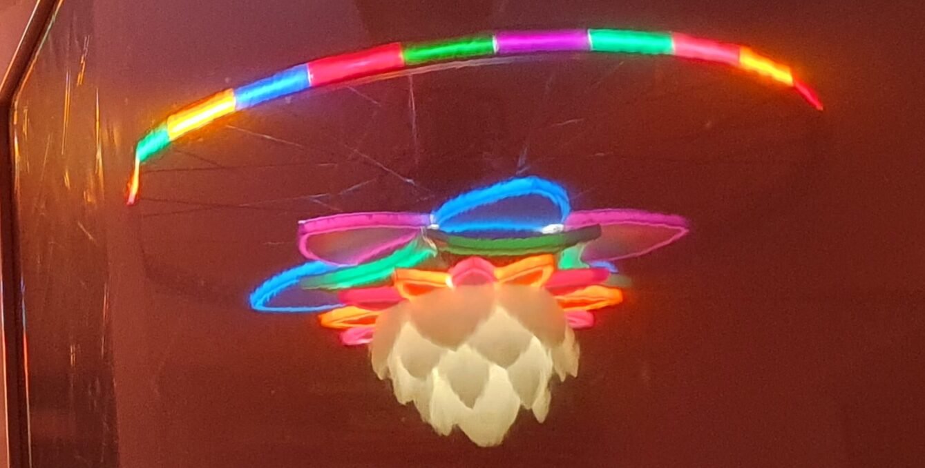 Composé d’une roue multicolore, d’une rosace à douze branches jaune orange et rouge, d’une rosace incurvée bi-vert, d’une rosace bleue et violette, une décoration centrale lotus luminescente.