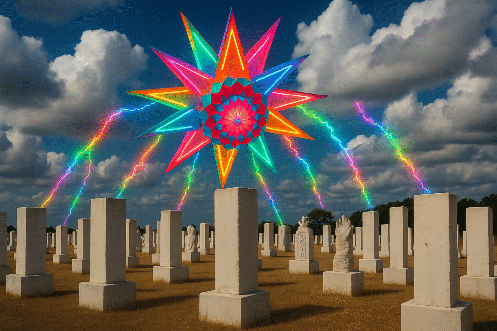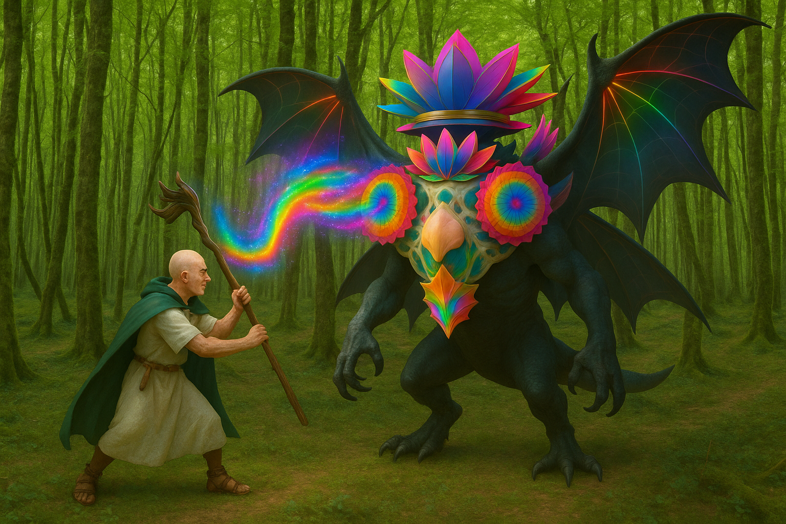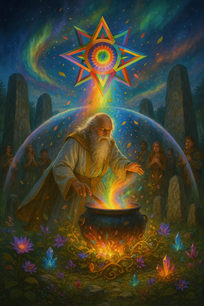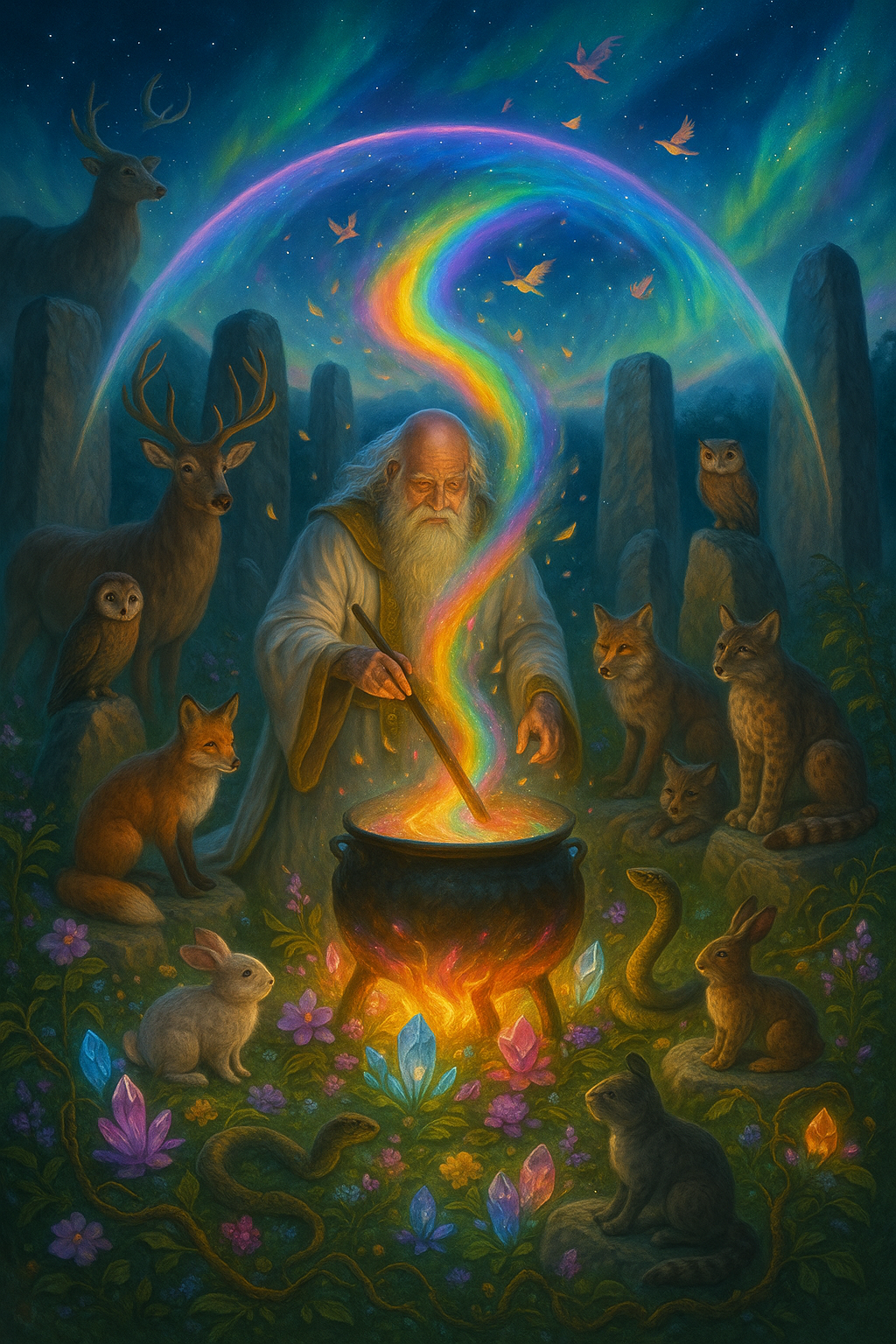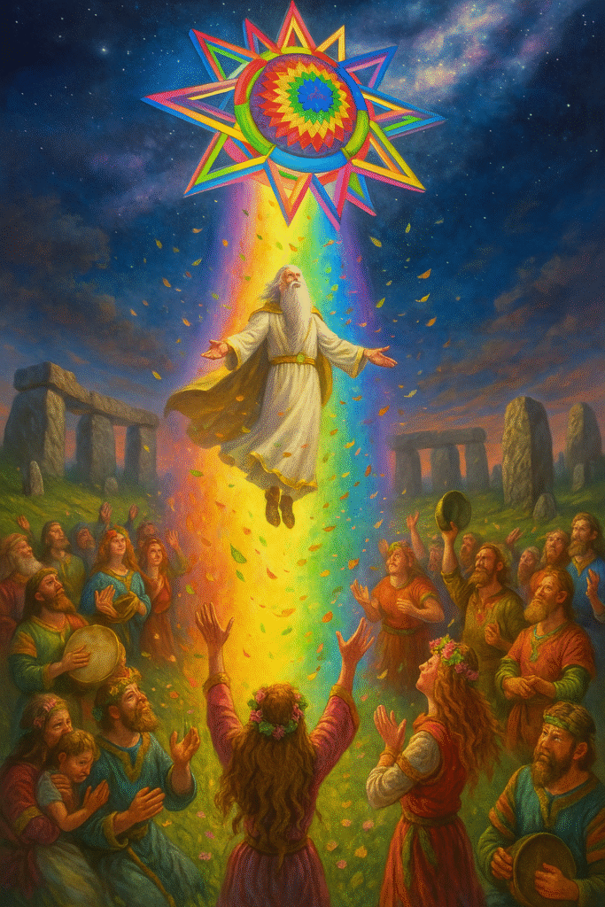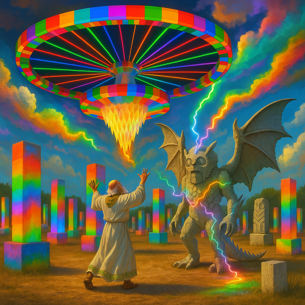 La communion des villageois bienheureux fit résonner le dolmen. Les pierres brillèrent d’une vague arc-en-ciel, laissant entrevoir des créatures, telles des ombres piégées dans la roche.
