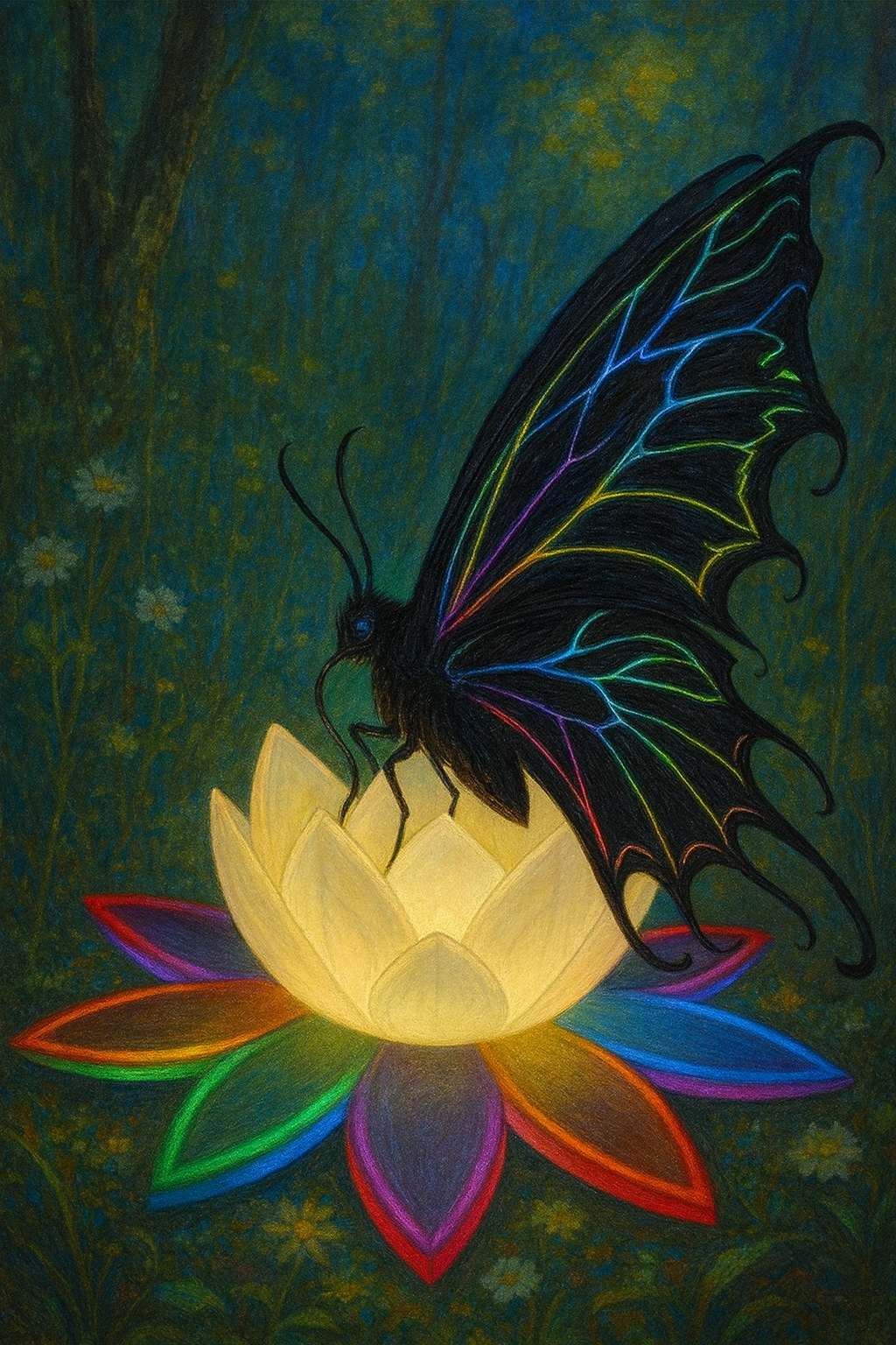 Quelque part dans notre galaxie, un papillon noir se nourrit de la couleur d’une Solendria Lutichroma. La couleur emplit les veines de ses ailes, alors qu’une nuance disparaît de la fleur.