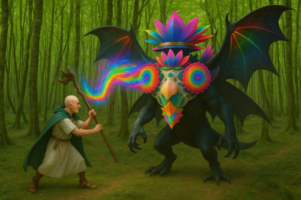 Après deux millénaires de poursuite sans trêves ni répits, le Chromogorgon pût enfin être acculé dans le dolmen enchanté, où un anneau chromatique de Dyson et Chauvessourix joignirent leurs forces pour pétrifier le Chromogorgon, laissant derrière lui un univers presque vidé de sa couleur.
